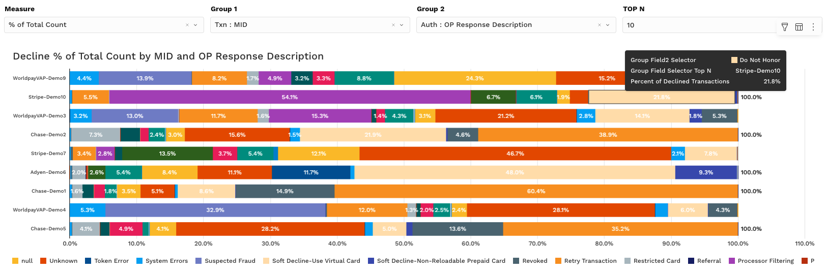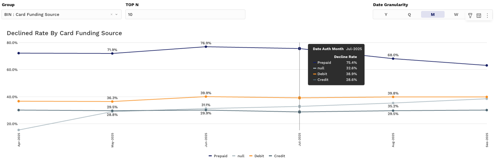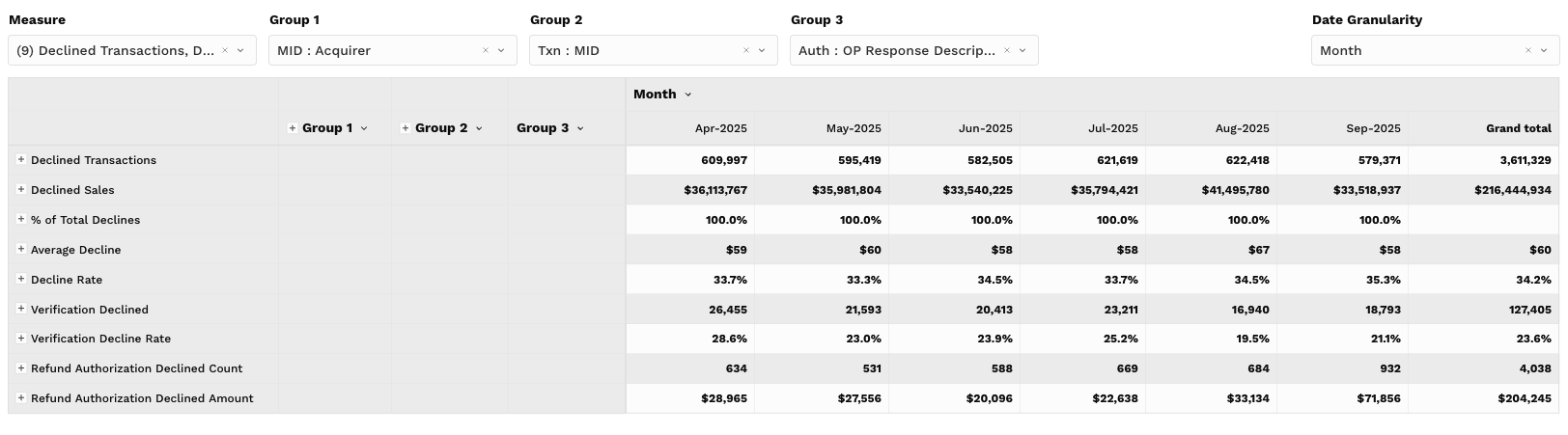 Grouping Filters: Narrow in on specific acquirers, card networks, issuer banks, or even individual decline reasons