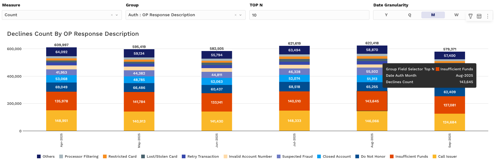 Top N: Focus only on your highest-impact records (e.g., Top 10 Issuers by Decline Count)