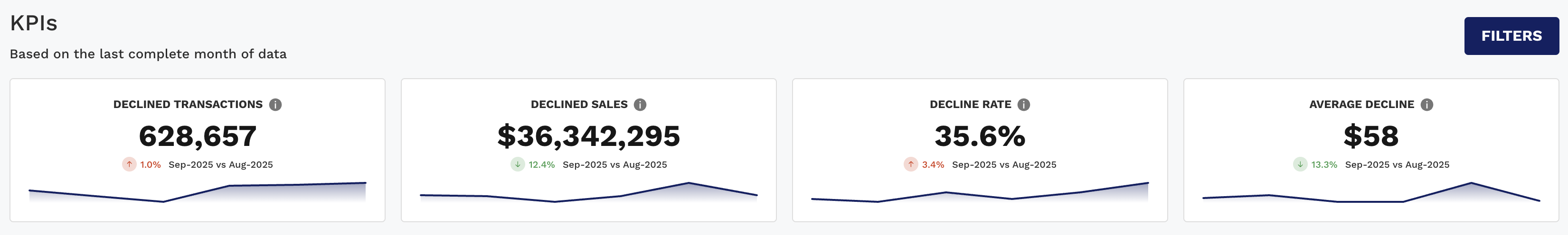 This section shows your most critical decline-related metrics, giving you a quick overview of trends and totals during the last complete month.