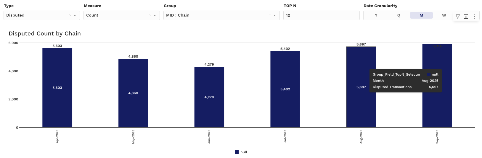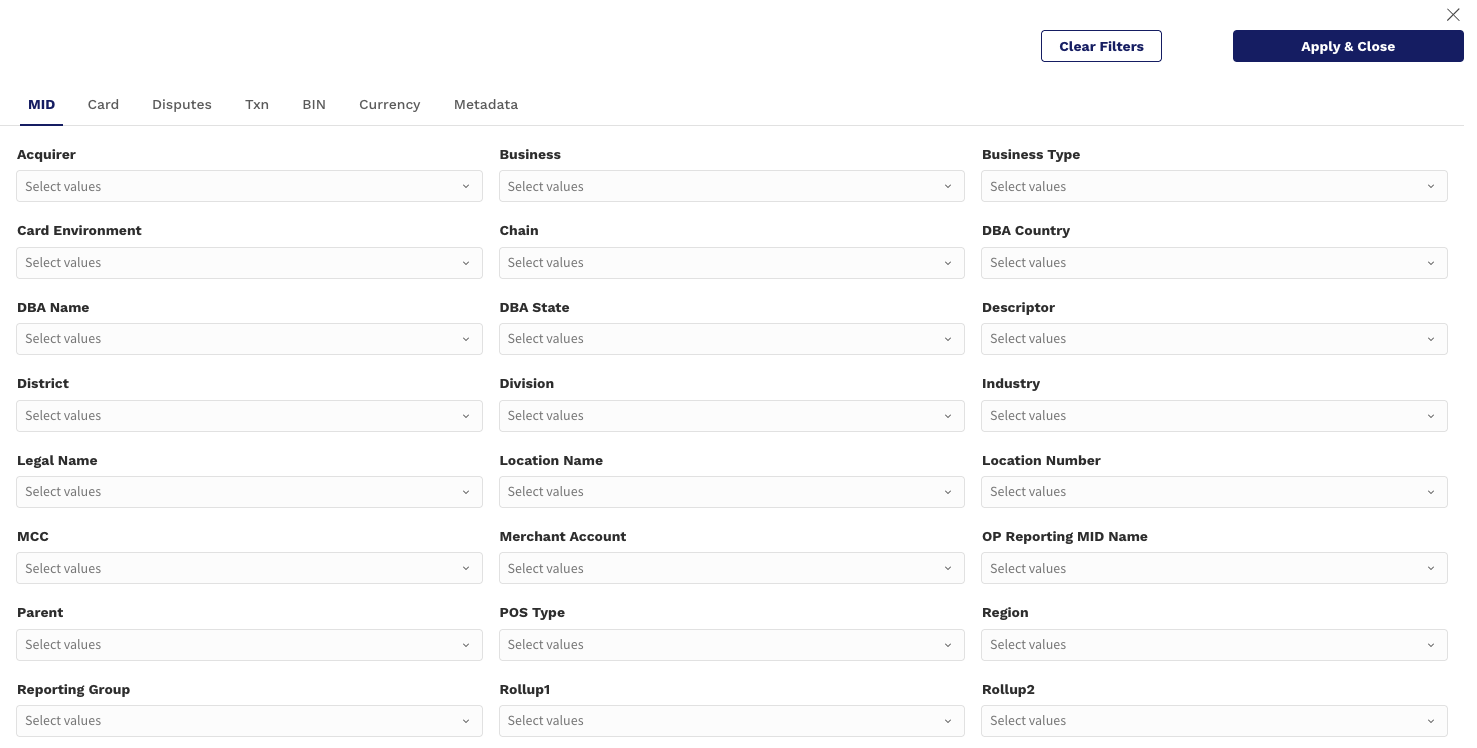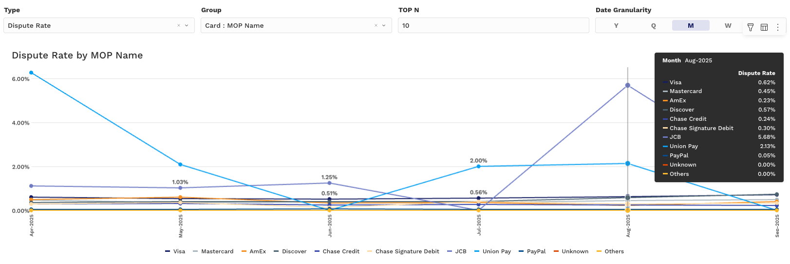 Grouped by: PSP, MID, Card Type, Issuer, or Reason Code