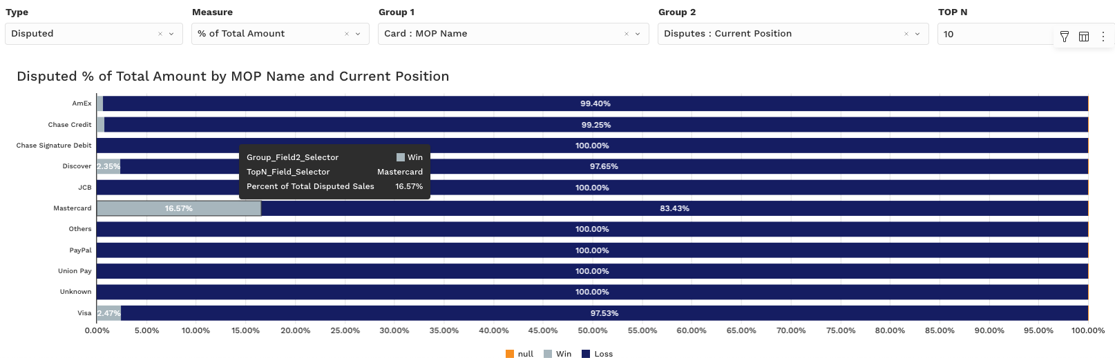 📌 Ideal for answering: “Which card brand has the lowest win rate on high-dollar disputes?” or “Where are we losing more than we’re winning?”