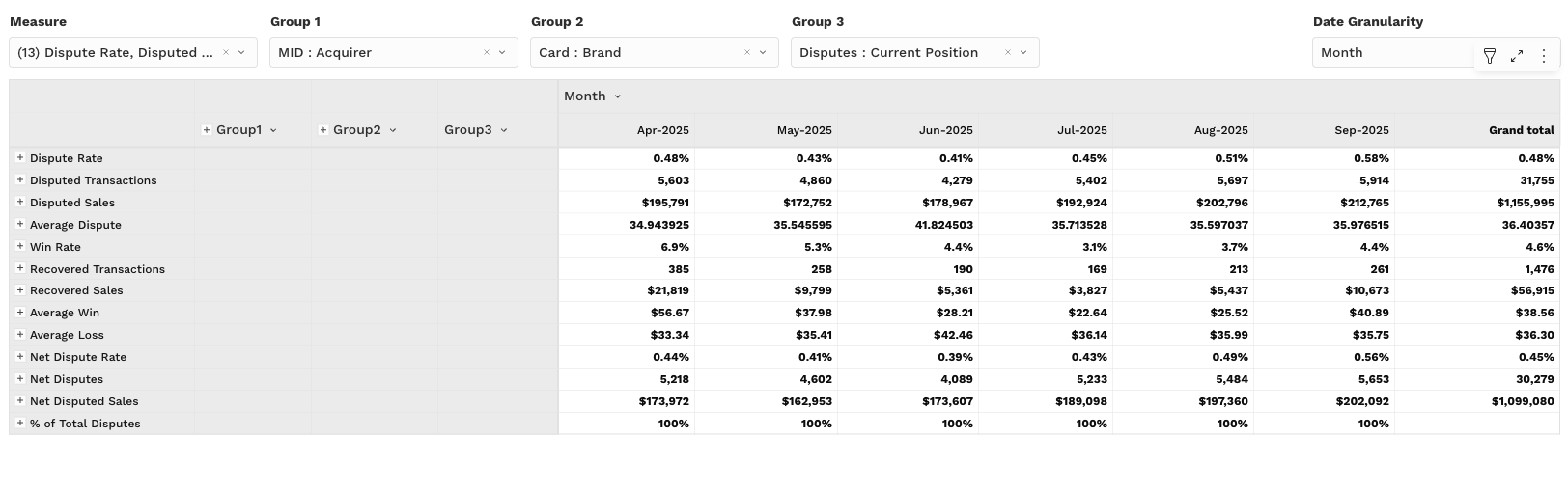 The pivot view enables granular analysis of dispute data with full control over grouping and aggregation, ideal for deep operational audits and finance reconciliation.