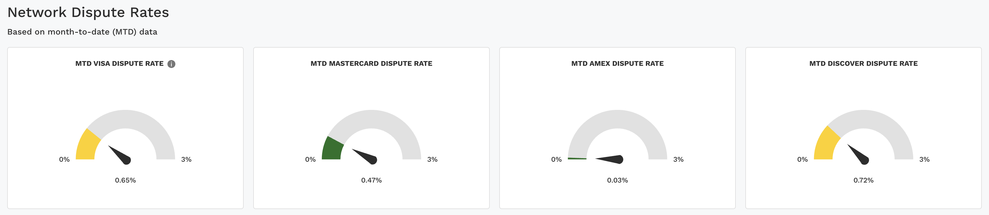 The gauge charts display dispute rates for Visa, Mastercard, Amex, and Discover. Each chart runs from 0% to 3%, with the arrow showing the current rate. The color bands highlight the health of the rate: